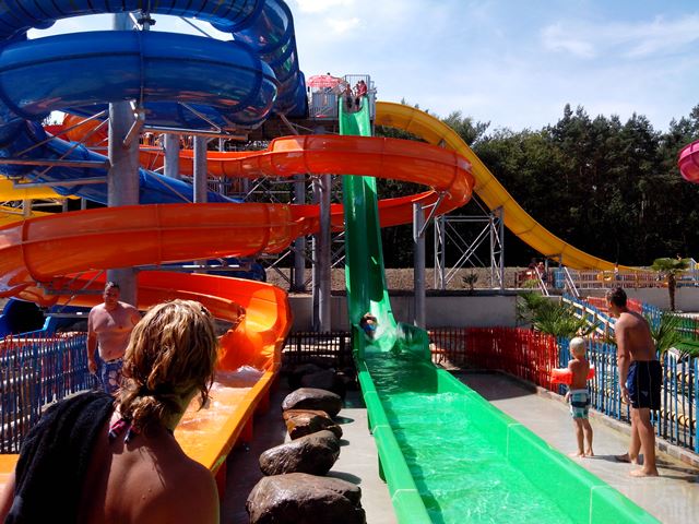 After relocating several existing attractions, crews from Polin began installing 11 new waterslides. Polin produced each of the new water slides using the latest resin-transfer molding (RTM) manufacturing technology, which creates a smooth, shiny finish on both interiors and exteriors of a slide's tubes. One important fact about the park is that all the waterslides end in dry-out (run-out) sections. There are no splash pools. Some of the new waterslides include: Rafting Slide - Black Hole Combination, Wave Slide, Body Slide, Black Hole, Compact Slide, Wide Slide, Multislide.